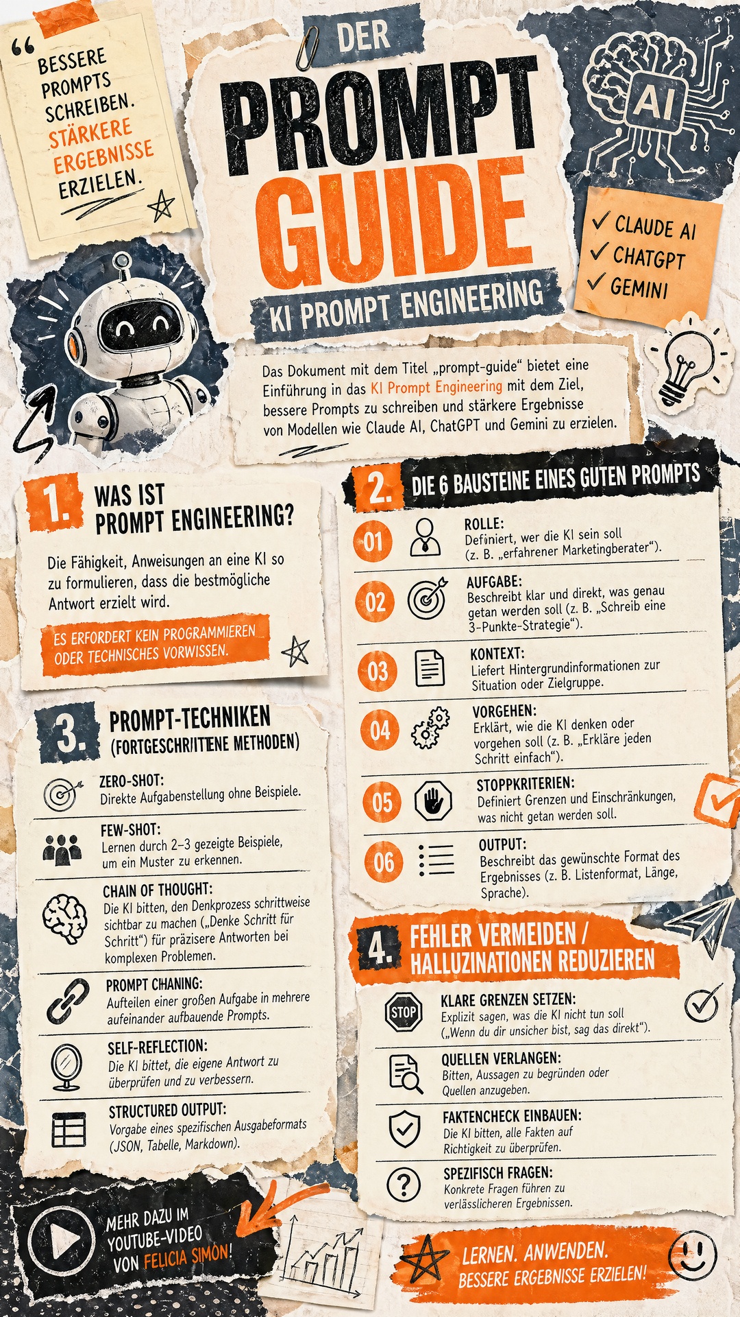 Prompt Engineering bedeutet, Anweisungen an eine KI so zu formulieren, dass du die bestmögliche Antwort bekommst. Es ist eine Fähigkeit, die jeder erlernen kann, kein Programmieren, kein technisches Vorwissen nötig.